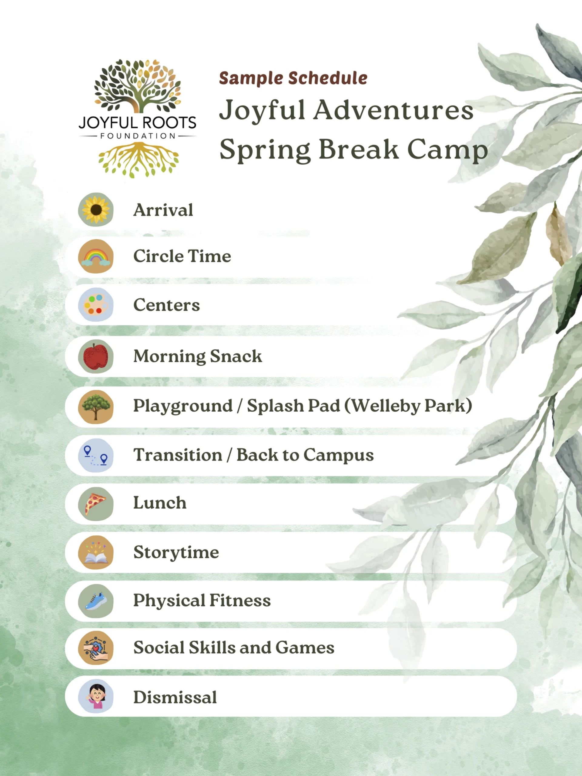 A $100 registration fee is required to reserve your child’s spot in the Joyful Roots Spring Break Program. This fee is applied toward the total tuition for the program and secures enrollment, as space is limited.